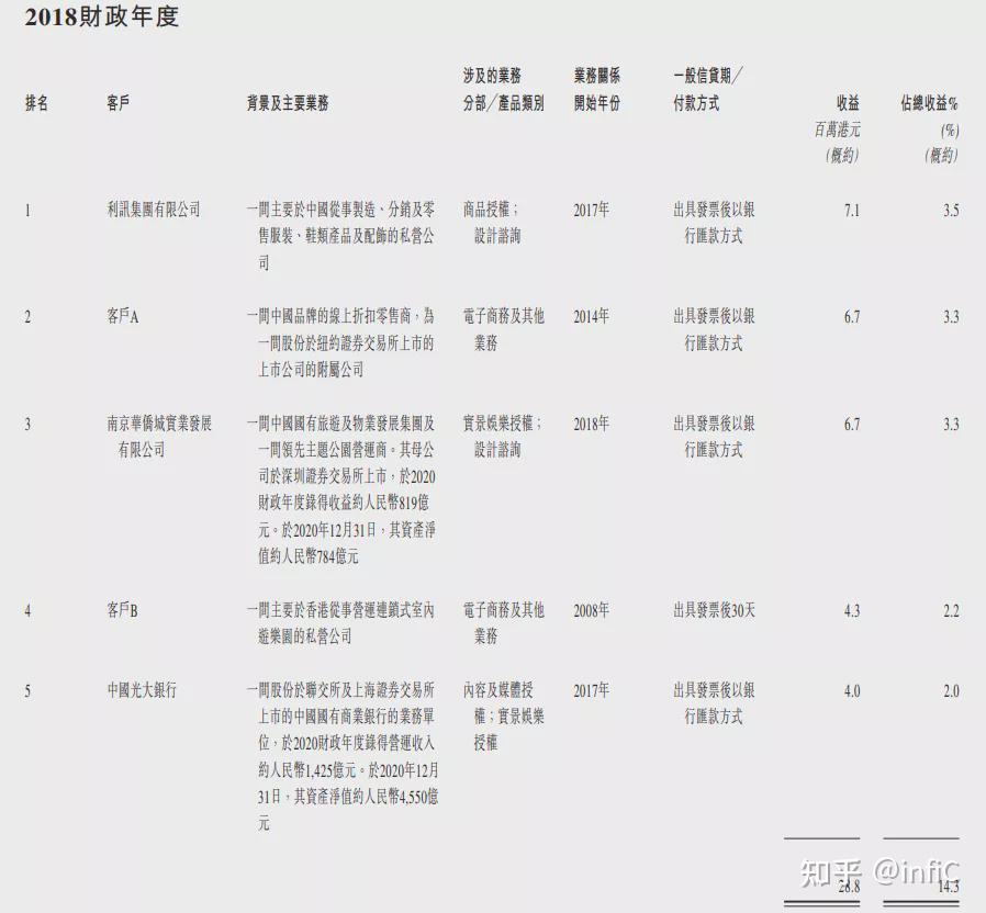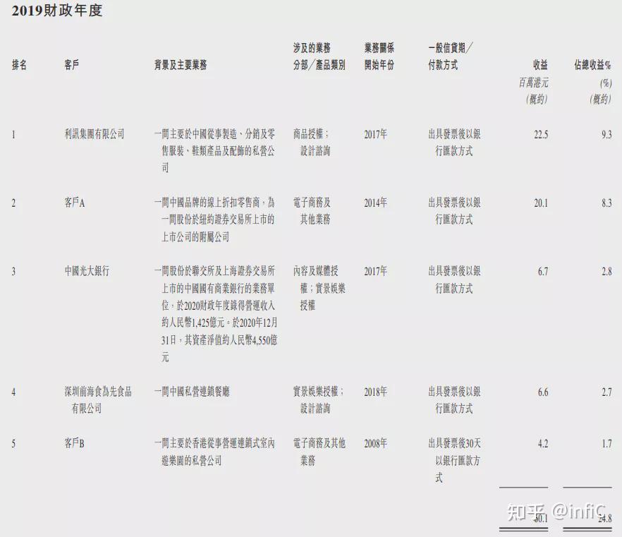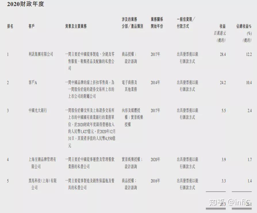 2020年前五大客户为利讯集团(收入约2840万港元)、唯品会(收入约2420万港元)、光大银行(收入约550万港元)、运营小黄鸭奶茶的上海至潮品牌(收入约390万港元)、餐具公司黑马科技(收入约330万港元);