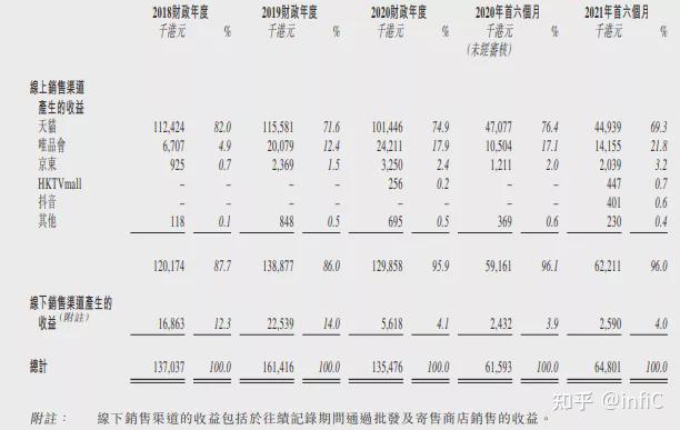 德盈自己的商品,主要是在天猫、京东店铺售卖,以及供给折扣渠道唯品会。2020年新增HKTVmall电商渠道,2021上半年新增抖音直播。